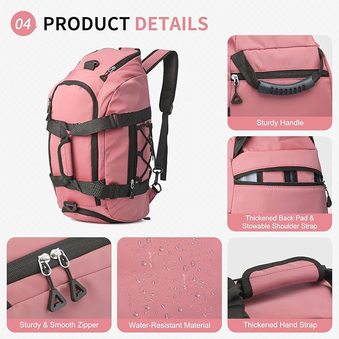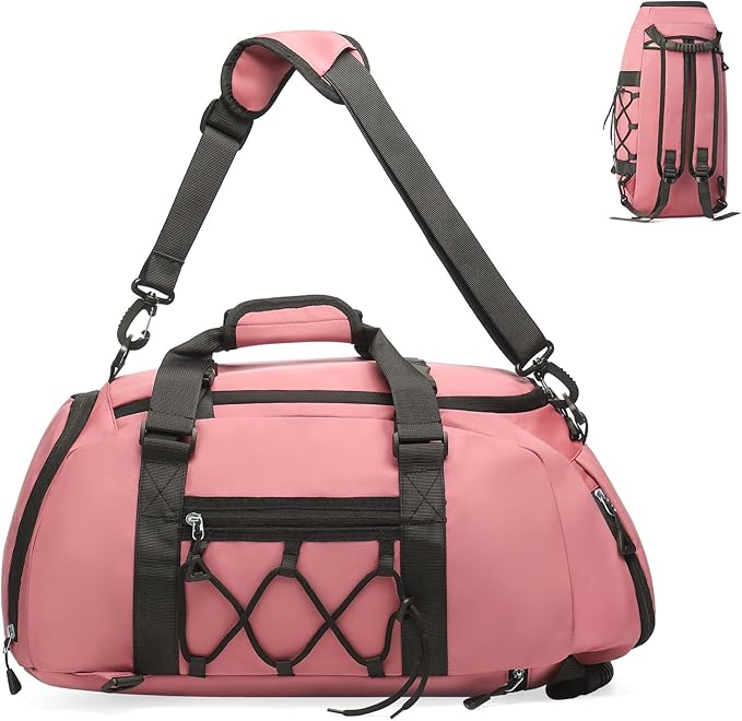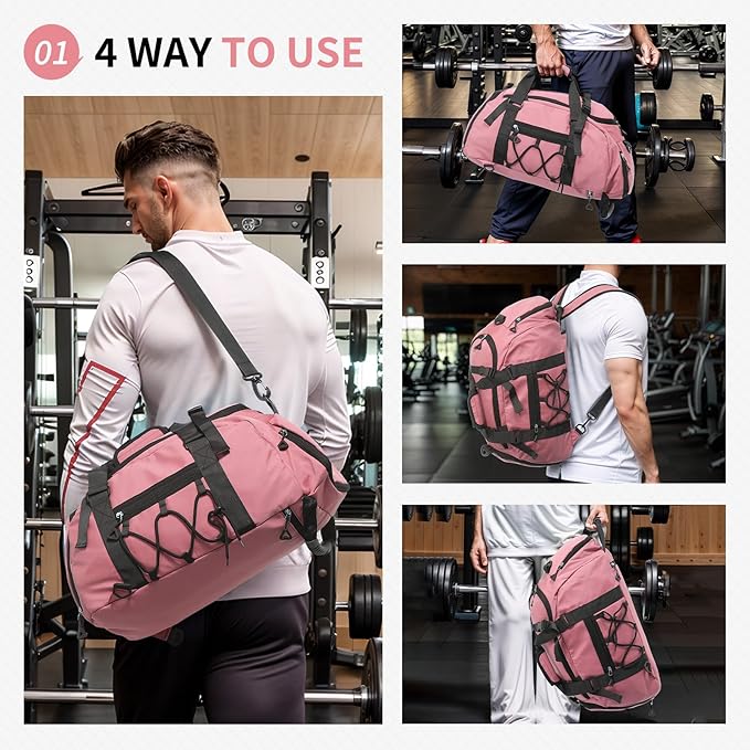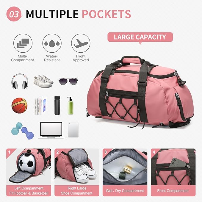 Unisex Travel Duffle Bag for Men Women, Waterproof Gym Bag with Shoe Compartment & Football Compartment, 32L Carry on Bag for Sports & Fitness, Pink