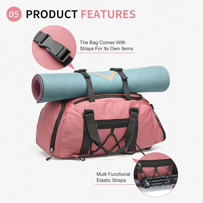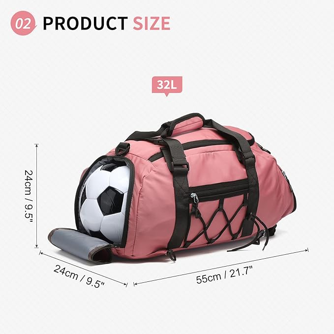 - -Spacious and Multi-Pocketed- The Travel Duffle Bag has a spacious main compartment, one front pocket, a shoe compartment, a football compartment, and a wet compartment. Front buckle straps secure your yoga mat. Its 32L, 21.7" (H) x 9.5" (L) x 9.5" (W) capacity ensures you can pack everything you need