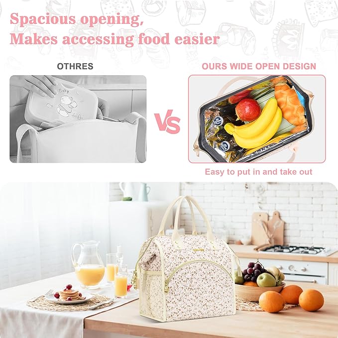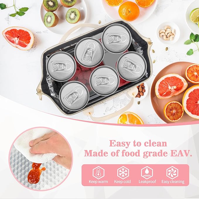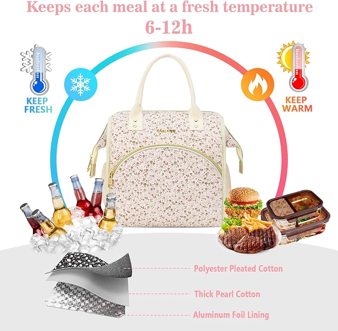 - [Superior Thermal Insulation] Designed with a durable aluminum foil lining and thick insulation, this lunch bag women keeps your food warm or cold for up to 8 hours. The food-safe, non-toxic material won’t melt when storing hot meals and is easy to wipe clean.