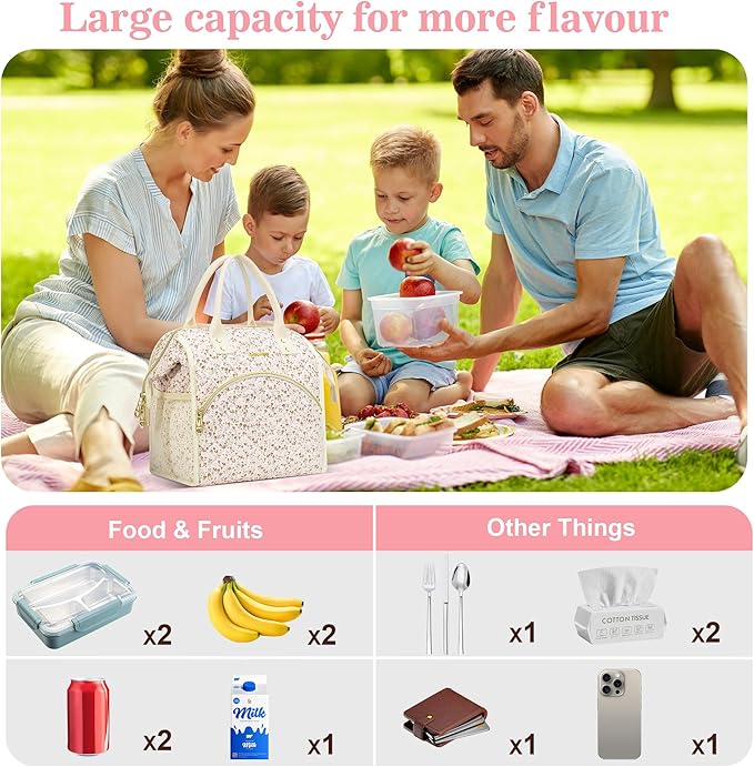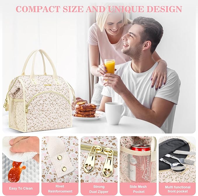LOKASS Insulated Lunch Bag Women- Reusable 10 L Lunch Box for Women - Leakproof Tote Cooler Bag for Adults Work, Beach, Travel, Picnic (White Small Florals)