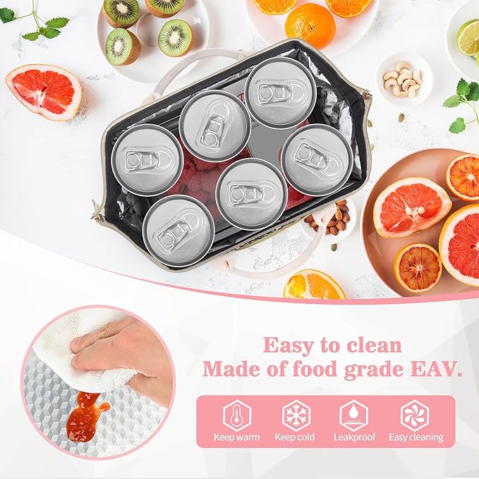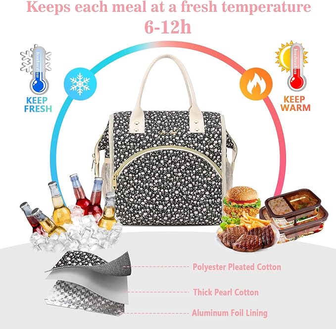 - [Superior Thermal Insulation] Designed with a durable aluminum foil lining and thick insulation, this lunch bag women keeps your food warm or cold for up to 8 hours. The food-safe, non-toxic material won’t melt when storing hot meals and is easy to wipe clean.