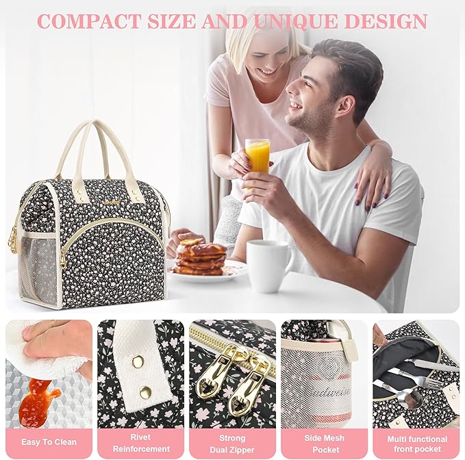 LOKASS Insulated Lunch Bag Women- Reusable 10 L Lunch Box for Women - Leakproof Tote Cooler Bag for Adults Work, Beach, Travel, Picnic (Black Small Florals)