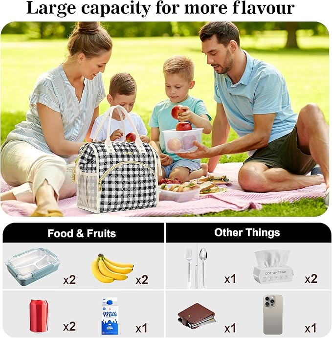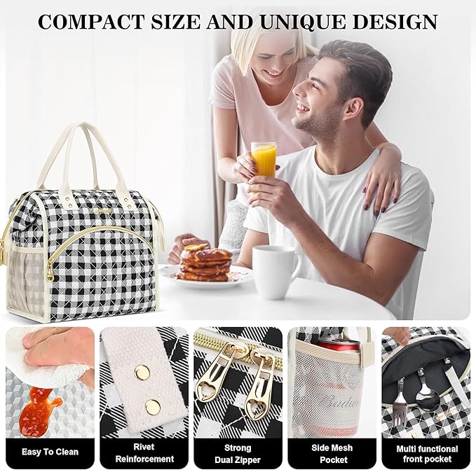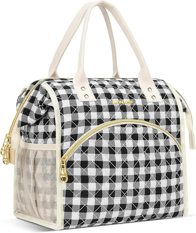 LOKASS Insulated Lunch Bag Women- Reusable 10 L Lunch Box for Women - Leakproof Tote Cooler Bag for Adults Work, Beach, Travel, Picnic (Black&White Diamond Grid)