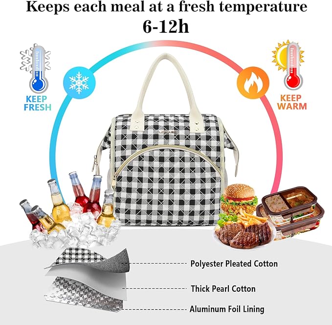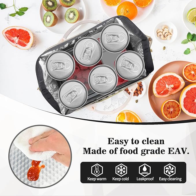 - [Superior Thermal Insulation] Designed with a durable aluminum foil lining and thick insulation, this lunch bag women keeps your food warm or cold for up to 8 hours. The food-safe, non-toxic material won’t melt when storing hot meals and is easy to wipe clean.