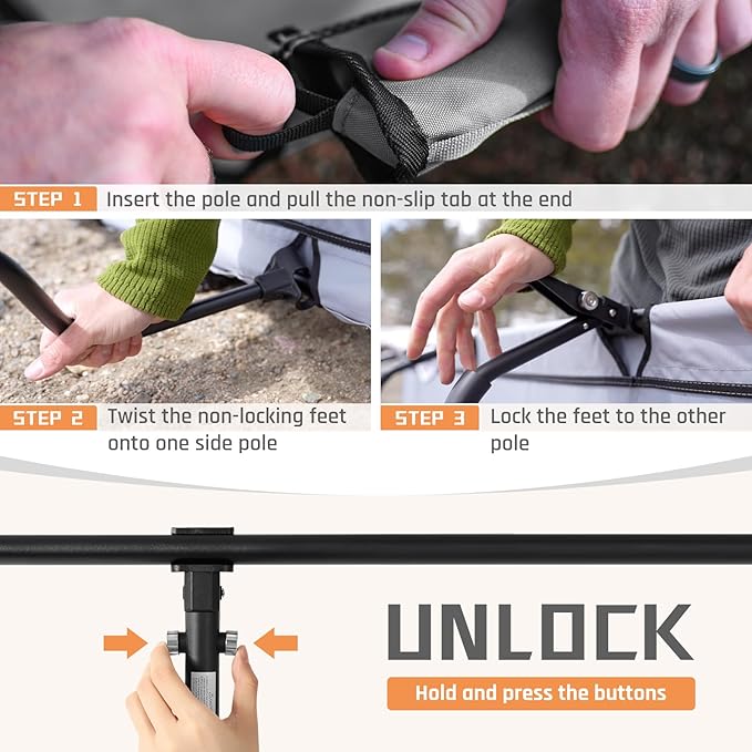 - Organized & Quick-access: camping cots for adults with roomy side pockets and MOLLE straps. The side pockets are detachable and can be moved to any seat of the side. You can keep your phone, books, water bottles, and other camp gear clean and dry. The MOLLE straps can attach camping essentials and giving you even more storage options within arm's reach.
