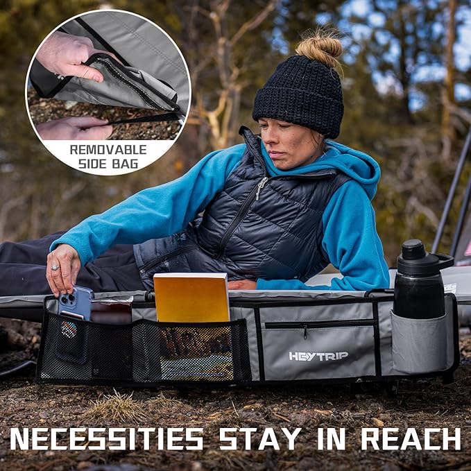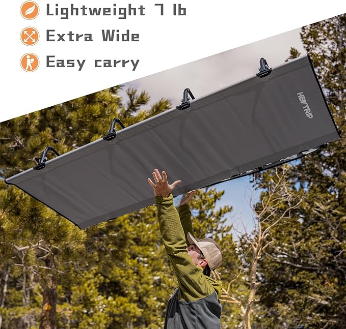 - Heytrip camping cot: Not just for car camping, take it fishing, to the beach, on a hiking and road tripping is a breeze with this backpacking cot. Bring it inside for a quick office nap or as a guest bed for family gatherings. With enough space for adults, kids or pets. Upgrade to Heytrip and experience the ultimate in versatility.