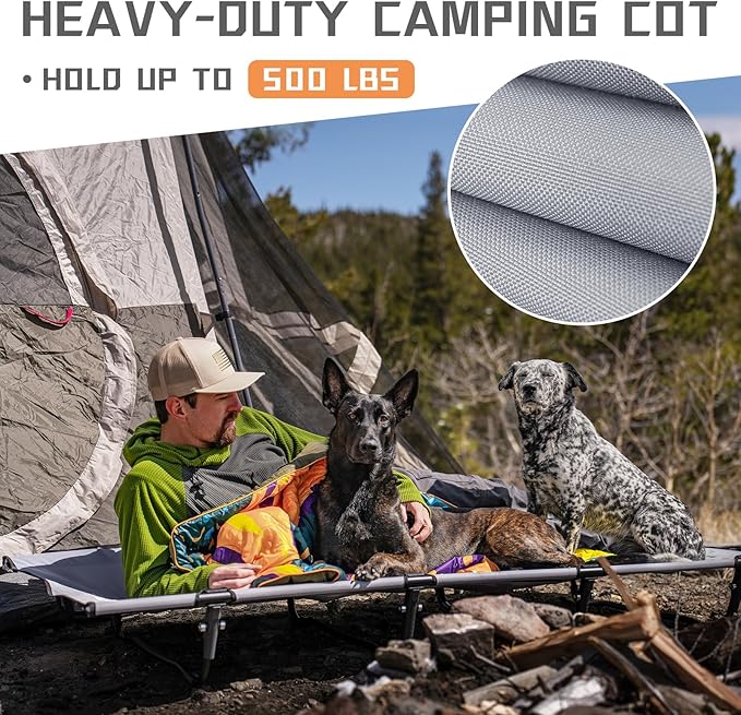 - Sturdy & Durable Ultralight Cot: Crafted from THICKER 7075 aluminum alloy, this sleeping cot frame is built to last, hold up to 500 LBS, you can rest easy. Its arc-shaped support design allows for stability on uneven or muddy ground throwing off your sleeping. Just turn around like at home and let the stabilizing non-slip mat do their thing and protects your tent.