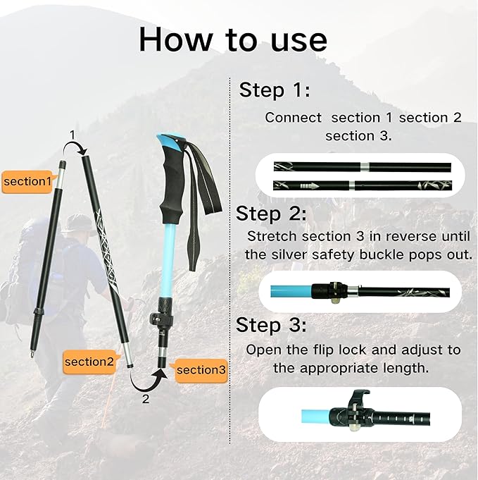 - Compact and Convenient Design: With a three-fold structure that collapses to just 13 inches, these trekking poles easily fit into a backpack's side pocket or can be securely attached to a waist belt, eliminating the hassle of cumbersome traditional hiking sticks.