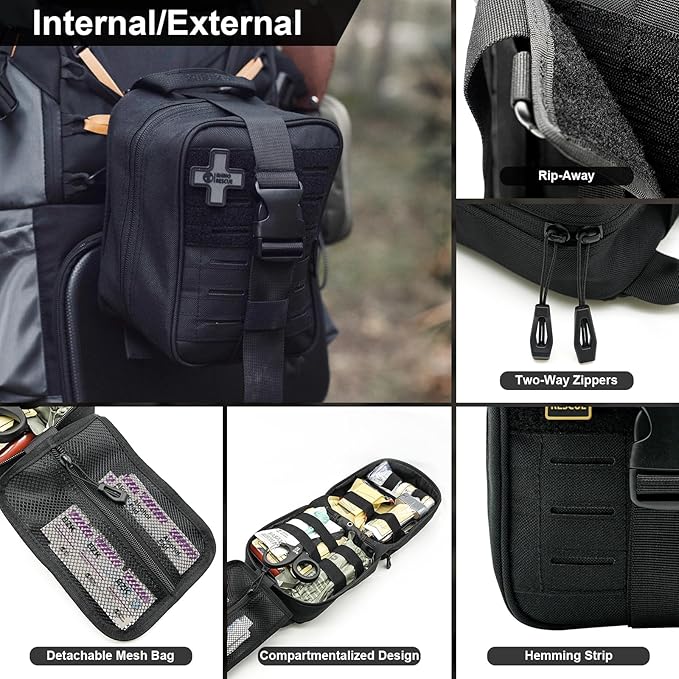 - [Organized Design] The first aid trauma kit interior compartments are strategically organized so that every item is exactly where you need it to be when seconds count. Rip-away panel allows for quick "Grab and Go" detachment universal adjustable backing attaches to any vehicle headrest