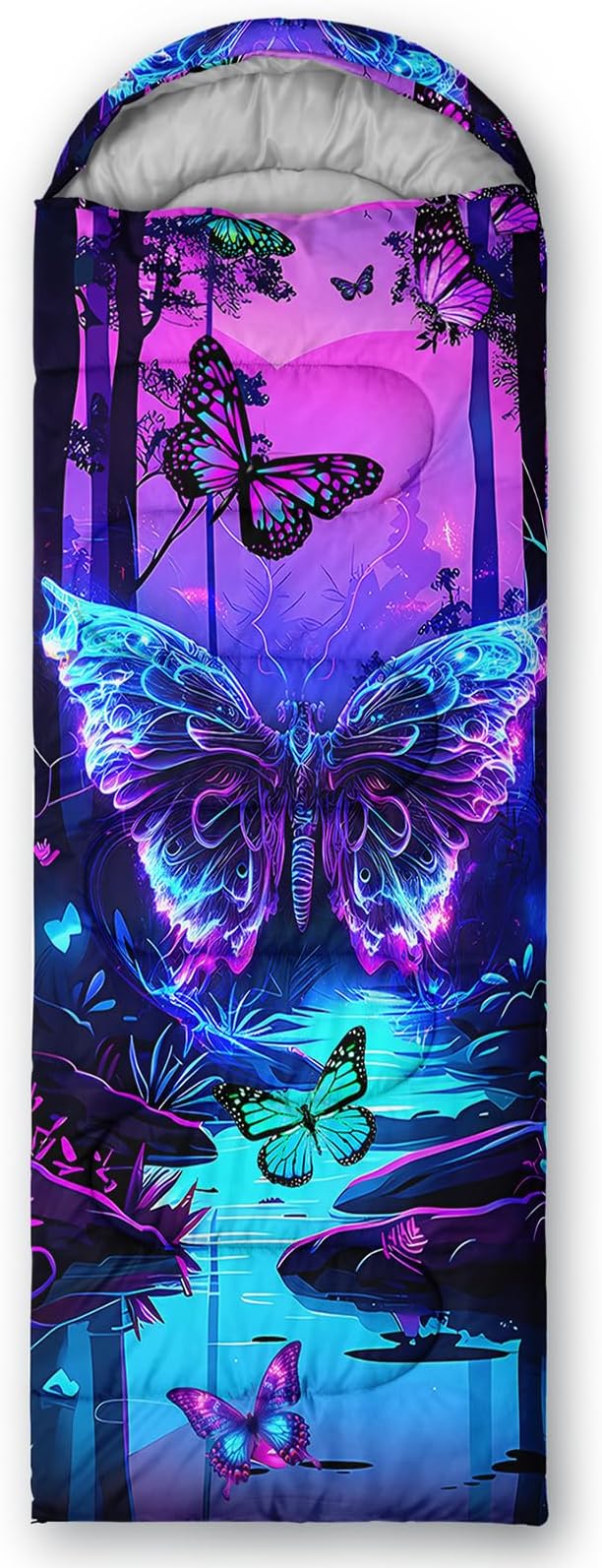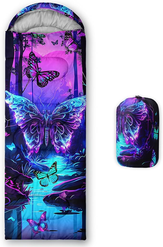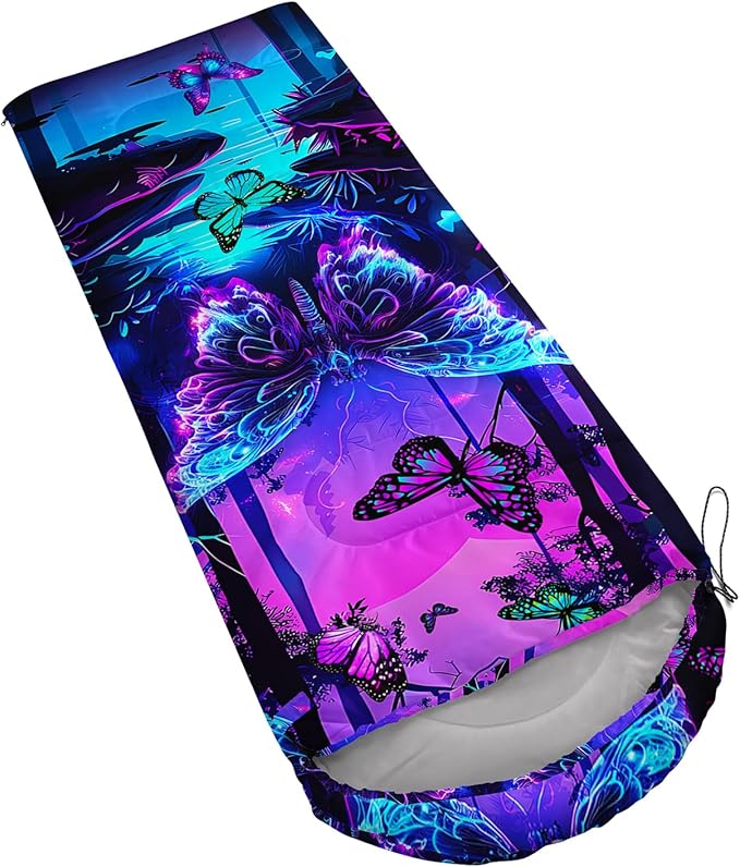 - Unique Butterfly Design:This Butterfly pattern sleeping bag is made of 3D digital printing with vibrant colors and patterns,size: 31W x 90L inches,temperature range: 32℉-77℉ (0℃-25℃),it also also have a weather resistant waterproof design to keep you warm and prevent you from any dampness,can be used in 3 seasons