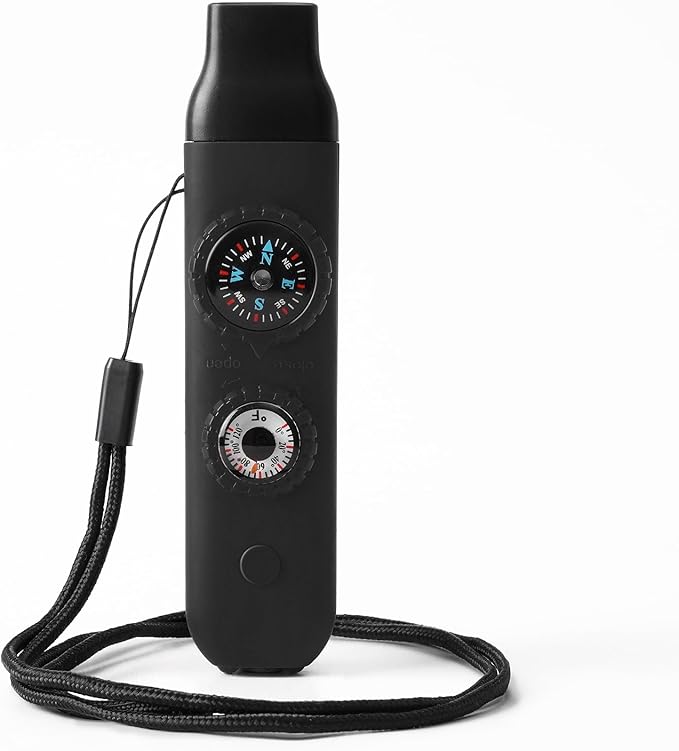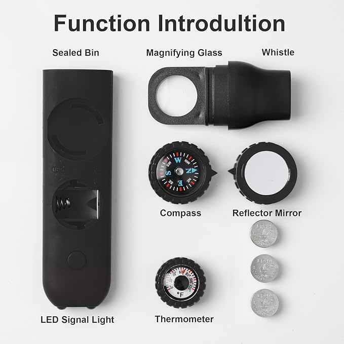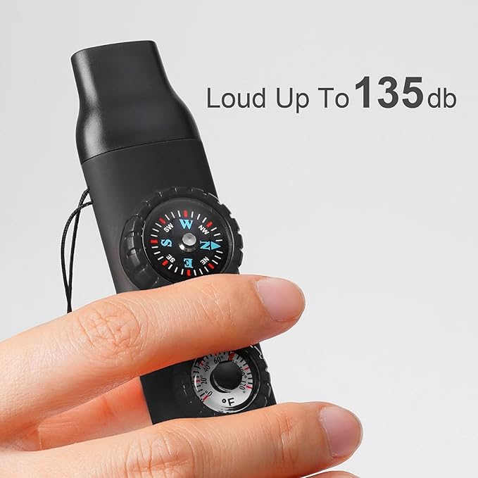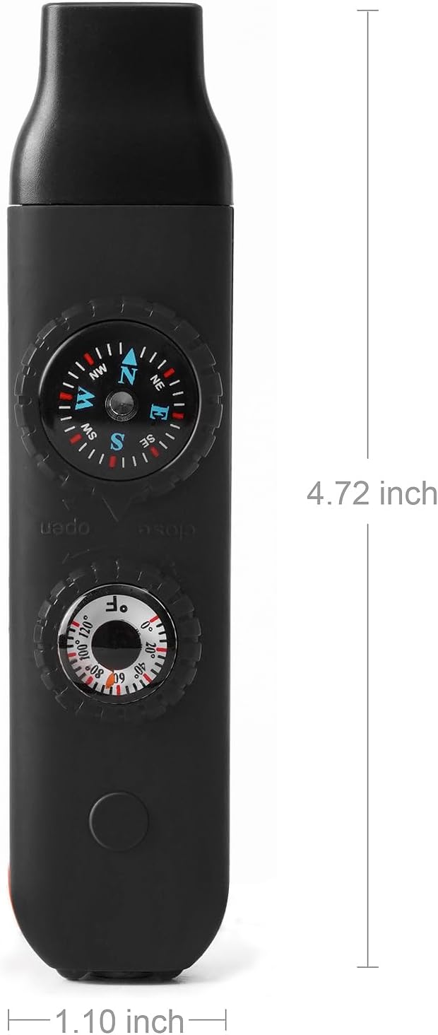 • The 7-in-1 Safety Whistle sets 7 functions including Emergency Whistle, Compass, Thermometer, LED Signal Light, Magnifying Glass, Reflector and Sealed Warehouse with good playability (The uniquely designed miniature built-in storage bin can be used to store important personal information, allowing rescuers to grasp your situation at the first time) (NOTE: If you need help in an emergency, you can try whistling softly, which is louder than whistling at full force)