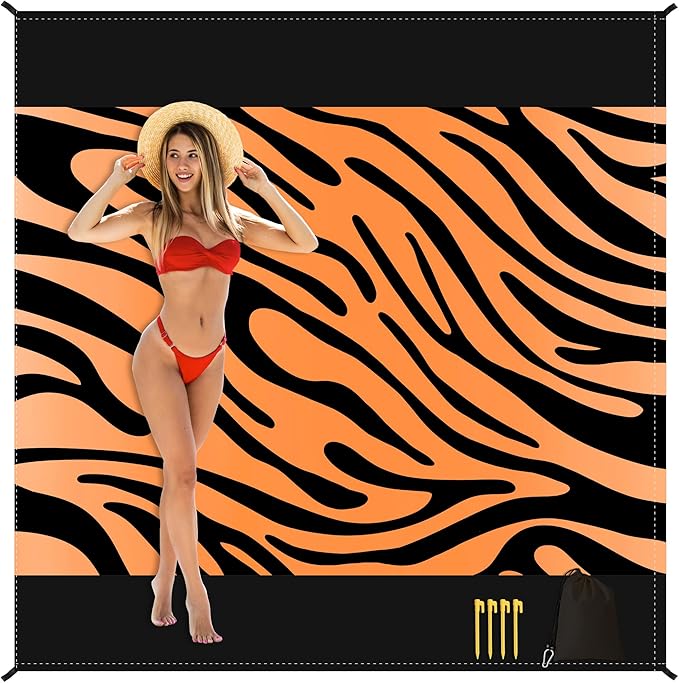 - Sandproof & Waterproof Tiger Stripe Beach Blanket: Embrace the wild with this sandproof waterproof beach blanket, featuring bold tiger stripes in black and orange. The 3000mm waterproof layer repels moisture, while the sand-resistant surface shakes clean instantly. Whether you’re on rugged terrain or sandy shores, this tiger stripe beach blanket is the perfect companion for your outdoor adventures.