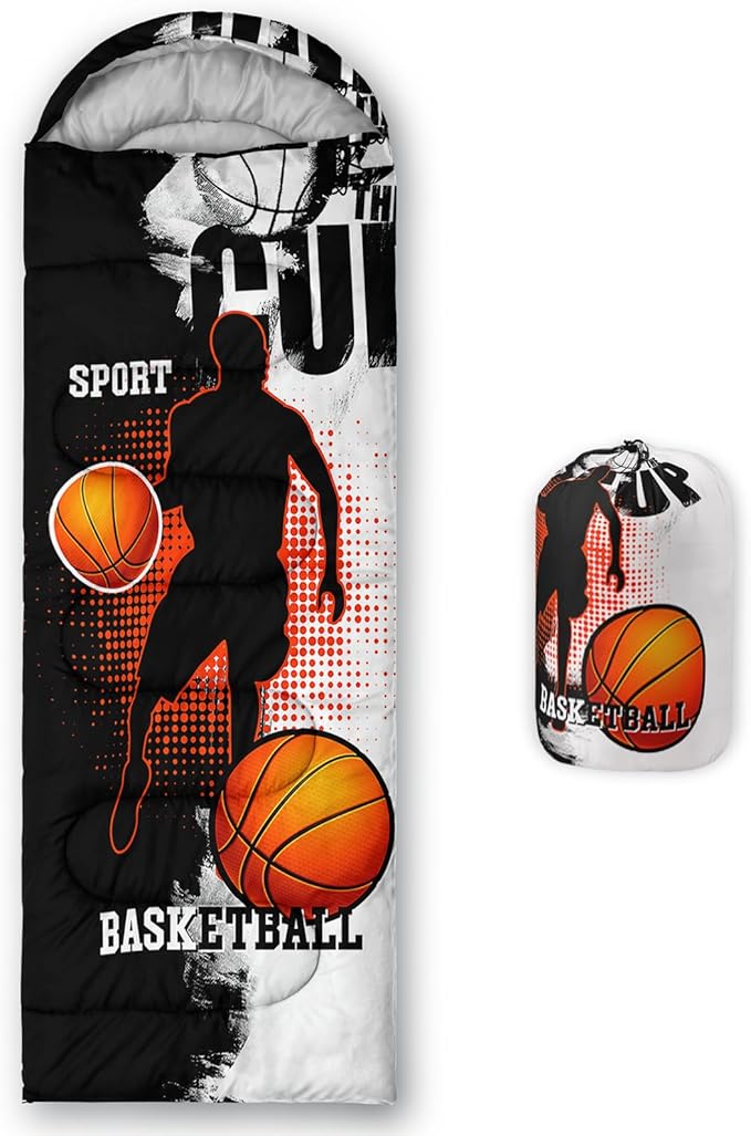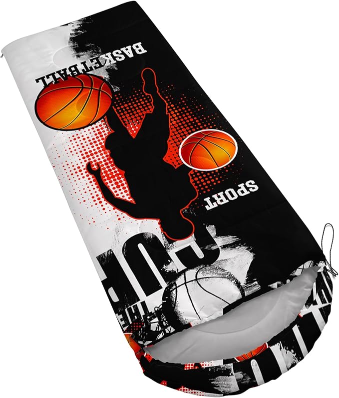 - Unique Basketball Design:This Basketball pattern sleeping bag is made of 3D digital printing with vibrant colors and patterns,size: 31W x 90L inches,temperature range: 32℉-77℉ (0℃-25℃),it also also have a weather resistant waterproof design to keep you warm and prevent you from any dampness,can be used in 3 seasons