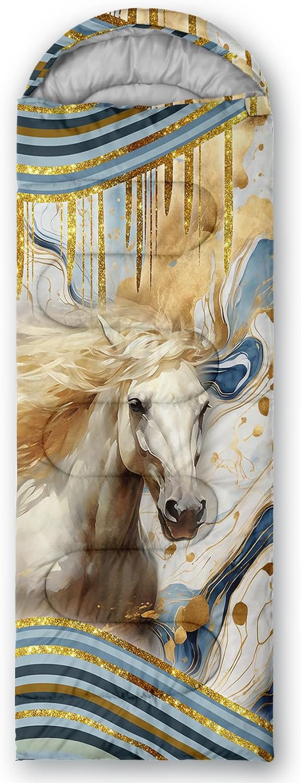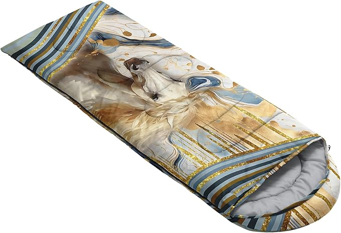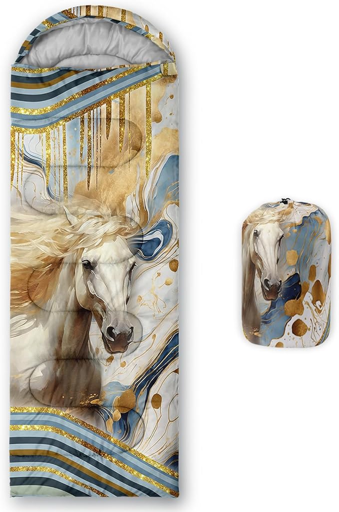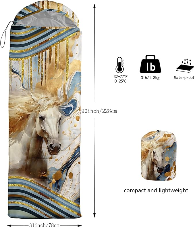 - Unique Horse Design:This Horse pattern sleeping bag is made of 3D digital printing with vibrant colors and patterns,size: 31W x 90L inches,temperature range: 32℉-77℉ (0℃-25℃),it also also have a weather resistant waterproof design to keep you warm and prevent you from any dampness,can be used in 3 seasons