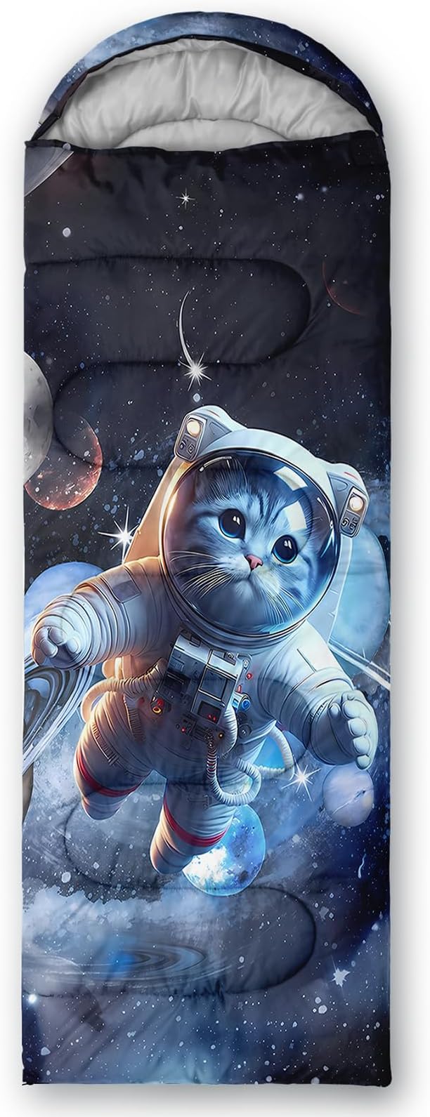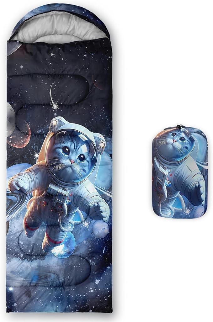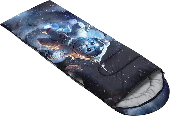 - Unique Space Cat Design:This Space Cat pattern sleeping bag is made of 3D digital printing with vibrant colors and patterns,size: 31W x 90L inches,temperature range: 32℉-77℉ (0℃-25℃),it also also have a weather resistant waterproof design to keep you warm and prevent you from any dampness,can be used in 3 seasons