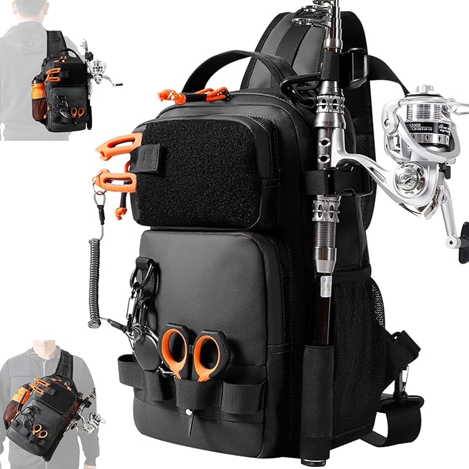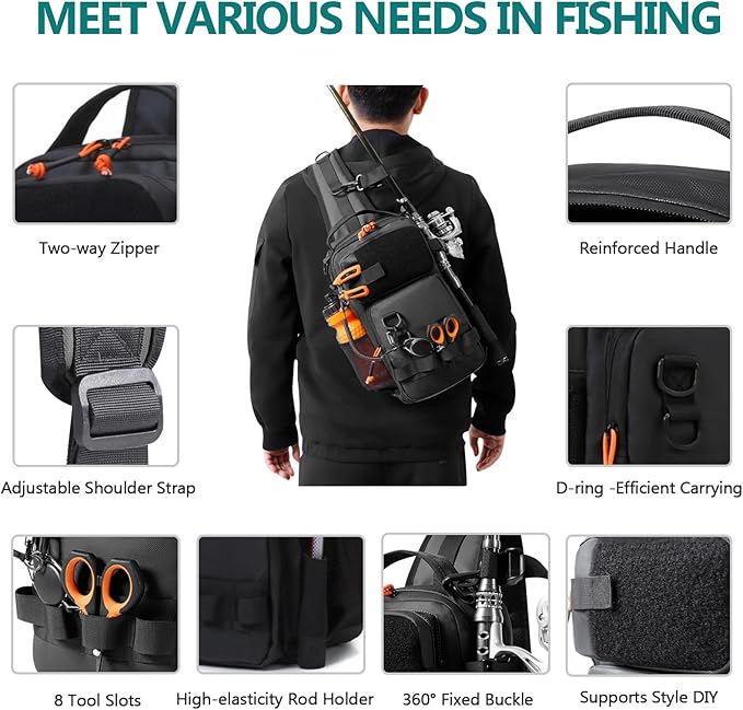 - Versatile Fishing Bags for Men: A fishing backpack with rod holder featuring 3 carry styles (shoulder, crossbody, chest), 8 tool slots, DIY Velcro panel, D-rings, 360° fixed buckle, two-way zipper, and adjustable strap. Compact yet practical