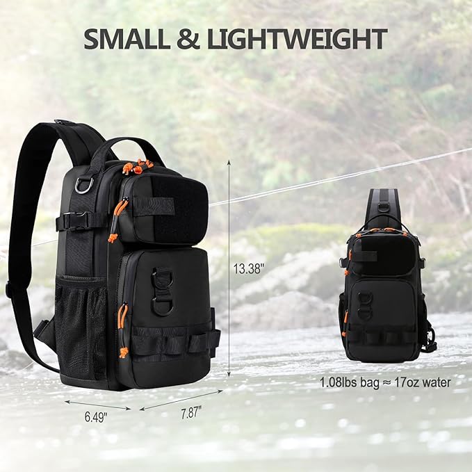 - Lightweight Fishing Backpack: Measuring 8.27'' × 6.5'' × 13.4'' and weighing just 1.08 lbs, this small tackle backpack is suitable for fly fishing, lure fishing, short wading trips, riverside hikes, and other outdoor adventures