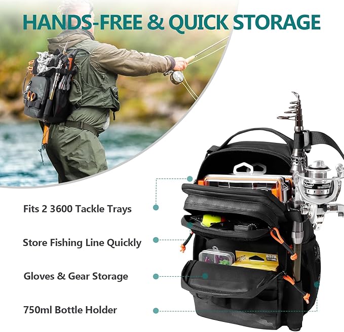 - Quick & Efficient Storage: This shoulder fishing bags holds 2 3600 tackle boxes in its 12L main space, has 8-slot MOLLE tool panel, dual side mesh pockets for 750ml bottles, plus waterproof top & bottom pockets for all your fishing gear & essentials