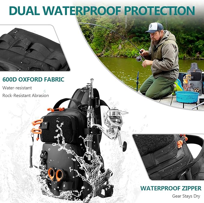 - Dual Waterproof System: Built with durable 600D Oxford fabric, waterproof coating, and seam-sealed zippers, this fly fishing sling pack keeps your gear dry and protected—no stress about rain, splashes, or accidental drops near water