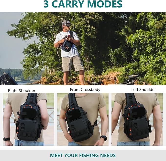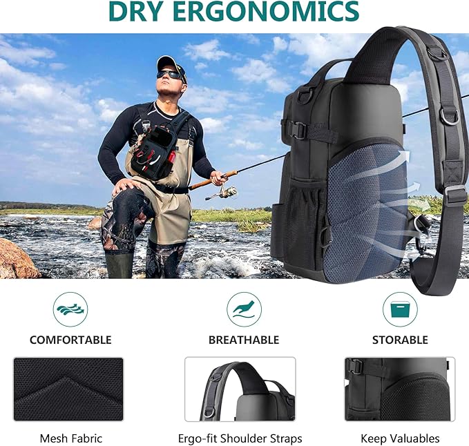 - All-Day Comfort: Featuring breathable mesh padding, wide adjustable shoulder straps, and an iPad-sized quick-access pocket, this fishing sling bag offers ergonomic support to reduce pressure, balance weight, and minimize fatigue during long fishing trips