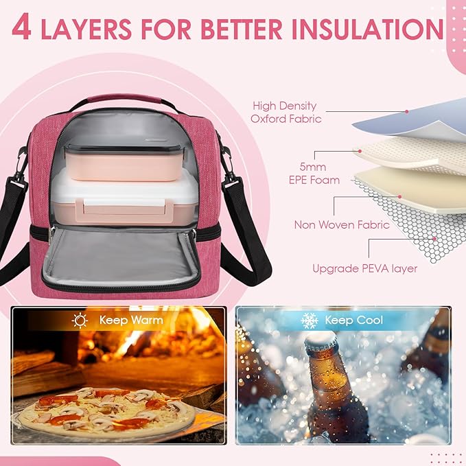 - 【Premium Materials & Insulated】Ymoilaky Insulated lunch bag for women men adopts four -layer heat insulation design: inner layer is food-safe PEVA material, middle 2 layers are thicken insulated EPE foam and Non woven fabric, and 600D Oxford cloth and polyester fiber on the outer layer. Our lunch bag women tote bag can keep your food fresh cold or hot for several hours, meet your whole day meals.