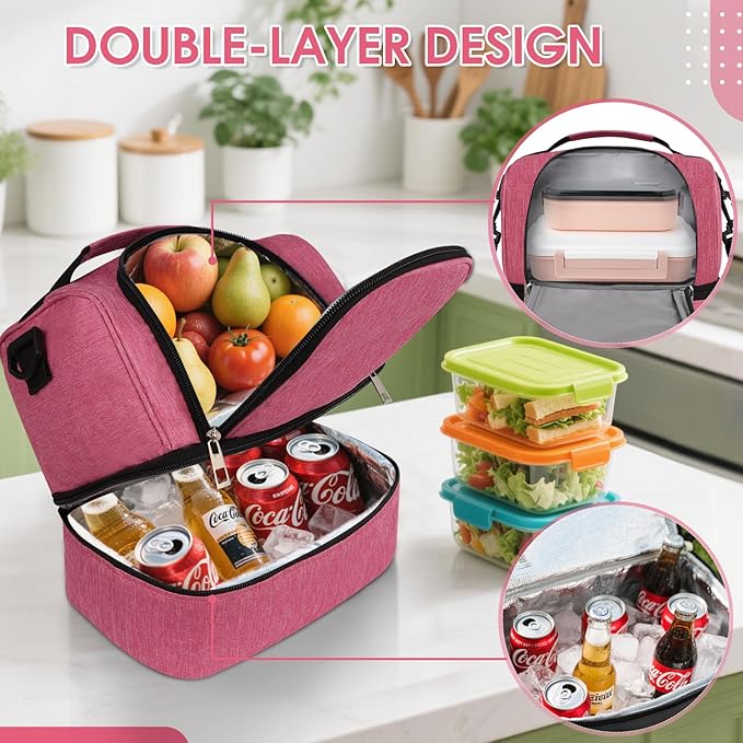 Lunch Box Lunch Bag for Women Men Reusable Insulated Lunch Bag Women Lunch Cooler Tote Bags with Adjustable Shoulder Strap for Office Work Picnic Travel, Rose Red