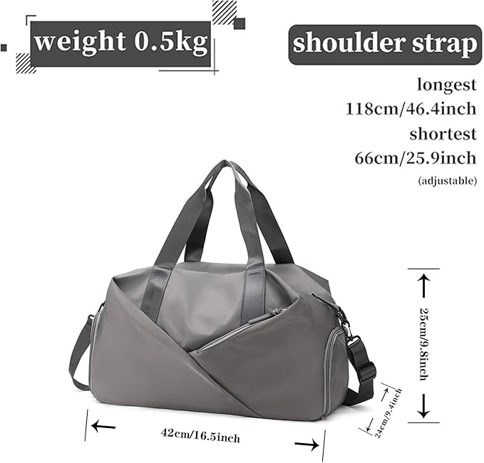 - Perfectly Sized & Versatile : Duffle bag for women and men, The size of this travel bag is 16.5"x9.8"x9.4", ideal as a carry on bag. With additional adjustable shoulder strap, the gym bag can be carried with you everywhere,use it for various activities, and sports such as tennis, dance, golf, football, crossfit, and swimming.