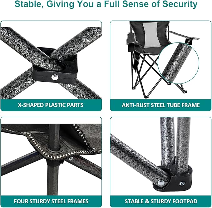 - Sturdy & Stable: Built with a robust steel frame and large anti-sink feet, this chair provides superior stability on various terrains, including grass, sand, and uneven ground. Supports up to 325lbs, making it suitable for most adults.