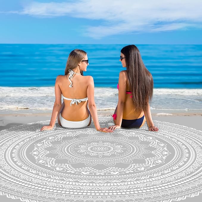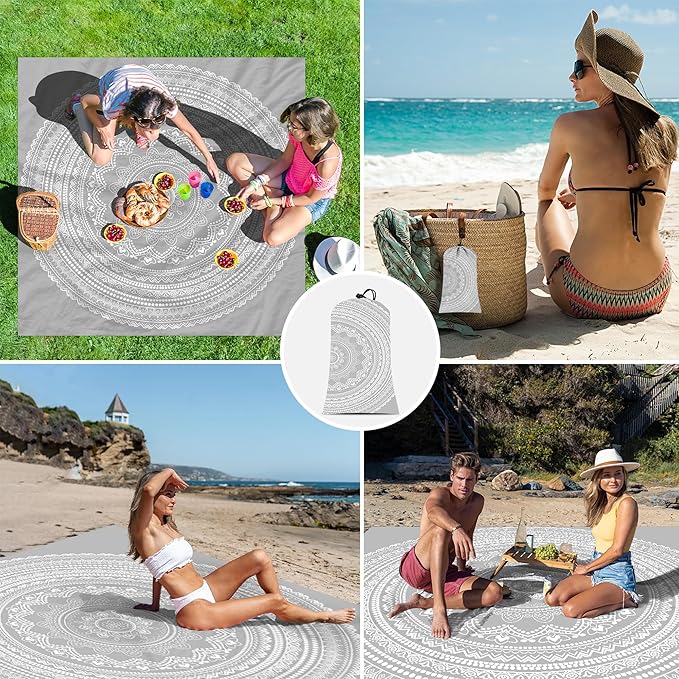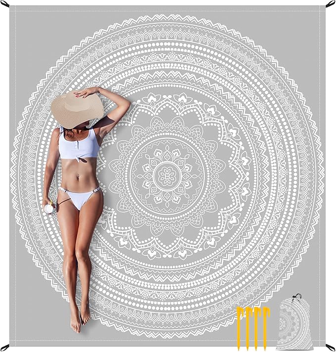 Beach Blanket Waterproof Sandproof, Large 78''×86'' Beach Mat for 1-4 Adults, Lightweight Compact & Quick Dry Sand Free Outdoor Picnic Blankets w/ 4 Stakes & 4 Corner Pockets-Grey Mandala Blossom