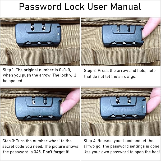 • Combination Lock Operation Instructions: To set your personal Combination. Please follow these steps. 1: Push the button with arrow on the right side to Open the lock(The original number is 0-0-0). 2: Push the button with arrow on the right side and don't let go. Turn the number wheel to the secret code you need. Don't forget the code! 3: Let go and the password setting is done.