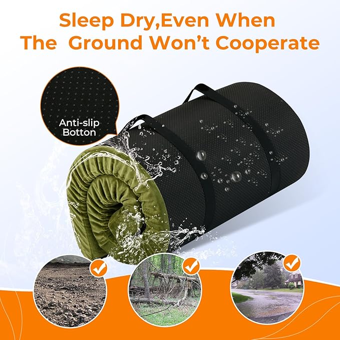 - All-Terrain Waterproof Design: The camping mattress pad features a removable washable cover with durable zip for easy cleaning and a textured non-slip base that works on wet tent floors or rocks. Waterproof velvet like plush fabric cover and non-slip textured base stays put on wet grass/tent floors while roll-up straps enable compact storage.