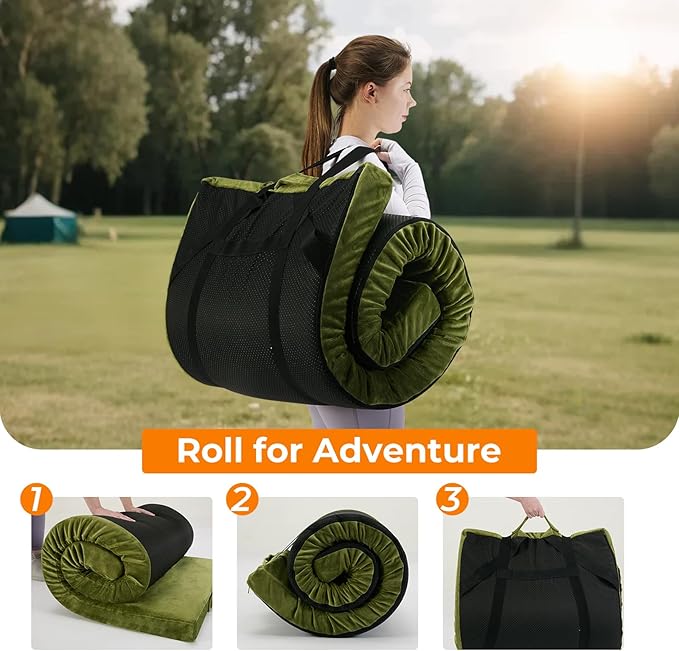 • All-Terrain Waterproof Design: The camping mattress pad features a removable washable cover with durable zip for easy cleaning and a textured non-slip base that works on wet tent floors or rocks. Waterproof velvet like plush fabric cover and non-slip textured base stays put on wet grass/tent floors while roll-up straps enable compact storage.