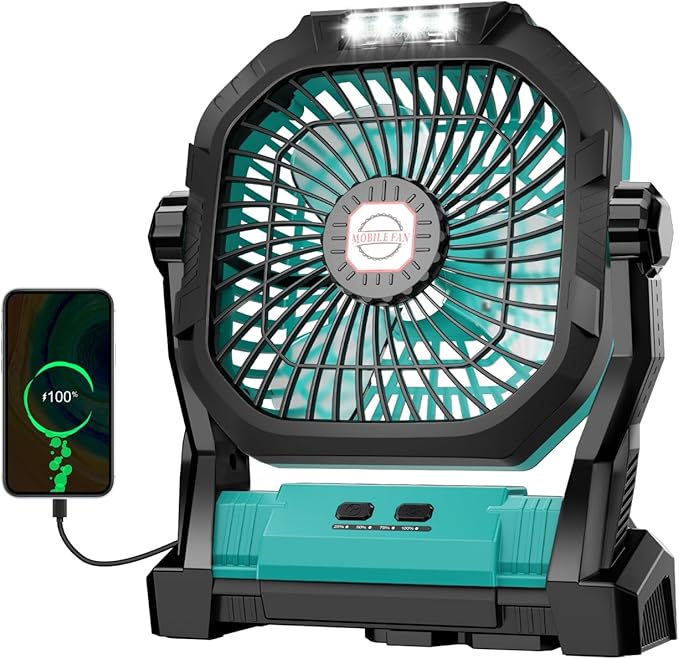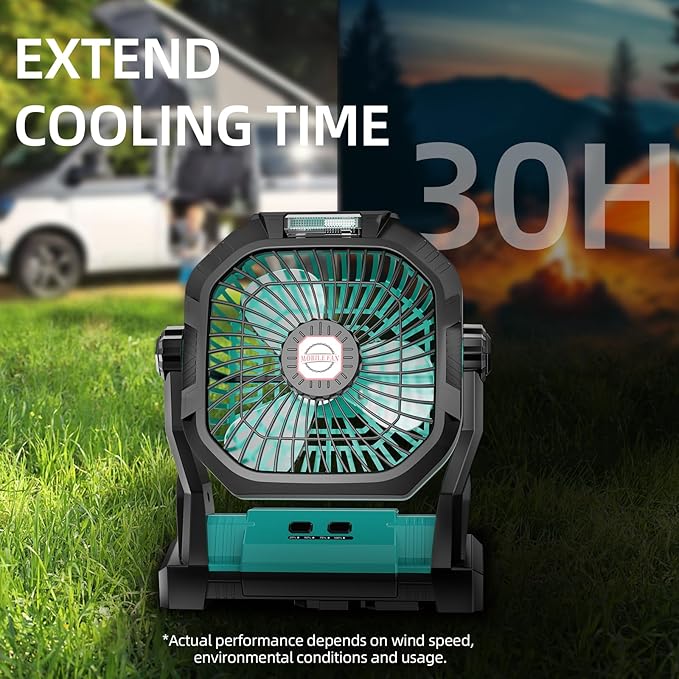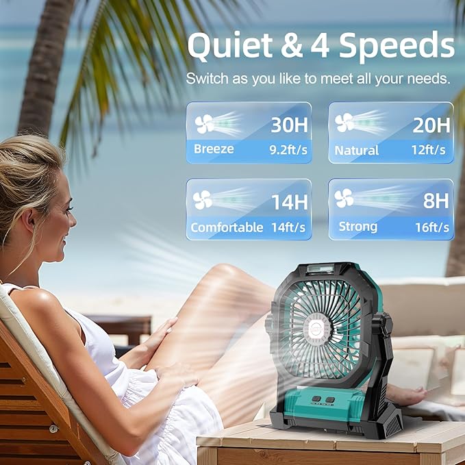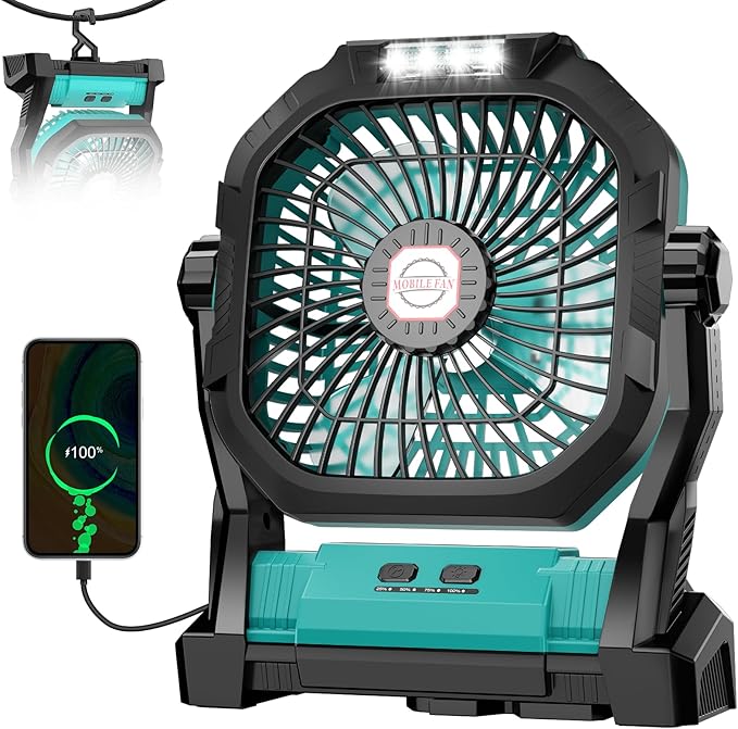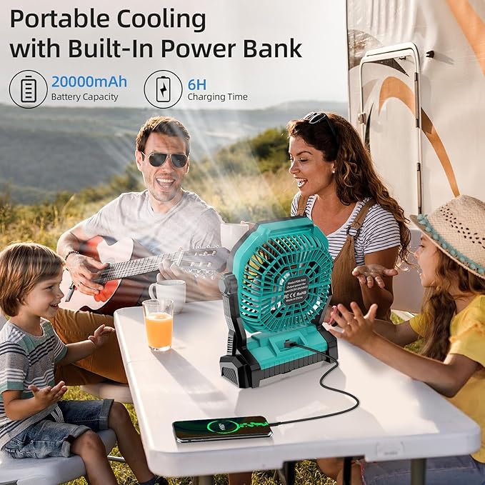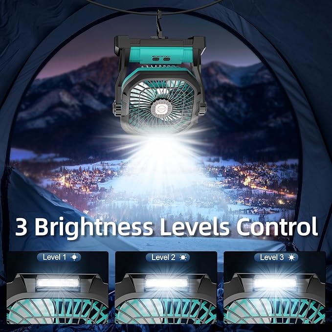 - [Long-Lasting Battery] Equipped with a 20,000mAh battery and 2A Type-C fast charging, this battery powered fan delivers 8-30 hours of airflow (or 50-100 hours of LED light) on a single charge. The LED lantern offers three brightness levels for soft, non-glaring light. Plus, the USB-A port allows you to use this battery operated fan as an emergency power bank for your phone or GPS, keeping you connected during your outdoor adventures. Note: USB-C only charges (not for power-out).