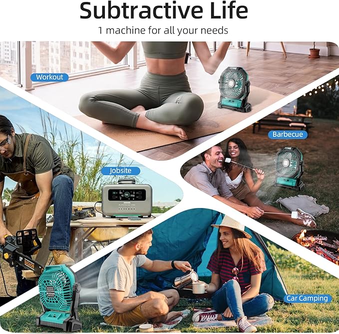 - [Compact for Outdoor Adventures] The portable fan camping gear is designed with a compact size that easily fits into your backpack for convenient carrying and storage. Whether you're car camping, fishing, picnicking, grilling, or relaxing on the beach, our multi-functional table fan is a camping essential to keep you cool and comfortable in nature.