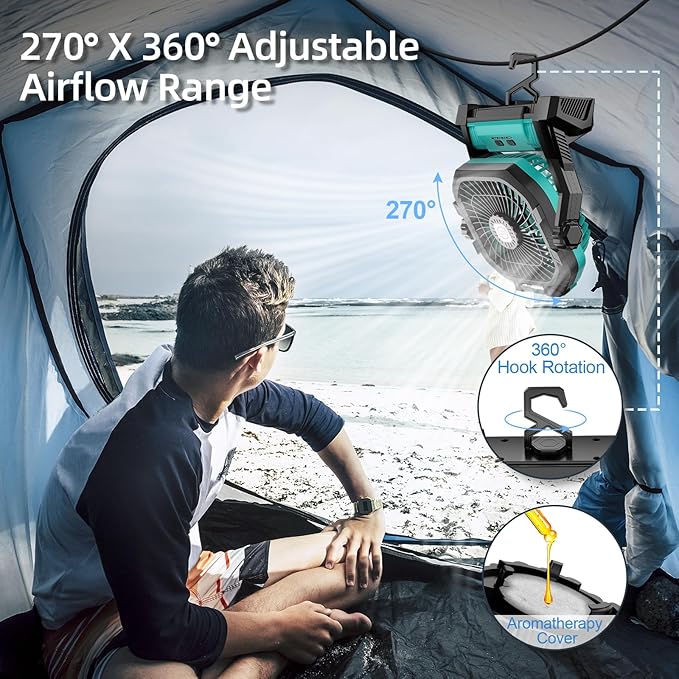 - [Powerful & Quiet] Experience strong airflow (16ft/s) with minimal noise (<30 dB) thanks to the premium motor and ultra-thin fan blades. This ensures excellent air circulation in your tent without disturbing your sleep. The travel fan also features a detachable aromatherapy cover - simply add your favorite essential oils to enjoy a refreshing breeze infused with fragrance.