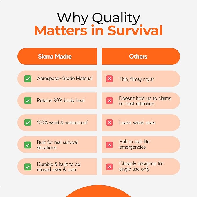 - STAY WARM IN ANY EMERGENCY: Designed for survival in extreme conditions, Sierra Madre’s thermal bivy sack reflects 90% of body heat, keeping you warmer for longer in cold weather. Ideal for survival kits, bug-out bags, camping, and hiking.