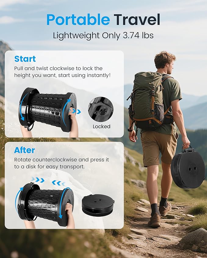 - 【QUICK& EASY】 One pull and twist clockwise to start using instantly! Make sure each layer is locked firmly before sitting. After use, just rotate counterclockwise and press it to a disk for easy transport, you can easily place it in your backpack, luggage or cars.