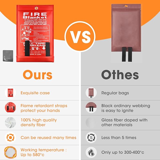 - High-Quality Flame-Retardant Materials: The fire blanket is made of durable fiberglass and flame-retardant fabric, which meets CE safety standards (EN 1869:2019). Effectively isolates heat sources such as grease fires, liquids or different types of fires, and can withstand high temperatures up to 1076°F (580°C). The emergency fire blanket can also be used to cover the body for additional protection during a fire