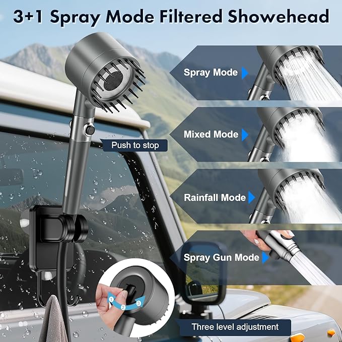 - [Multi-mode Filtering Showerhead]: This portable electric shower offers 4 spray modes, and you can switch them according to your personal needs. This outdoor camping shower is equipped with a built-in filter to remove impurities, dirt and dust, protecting your skin and hair. It is convenient and safe to enjoy a bath even outdoors.