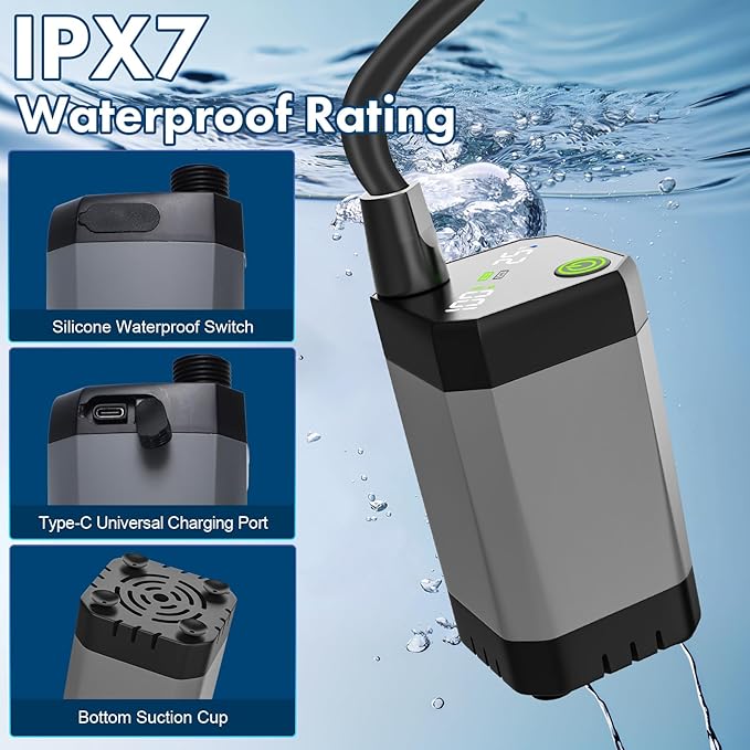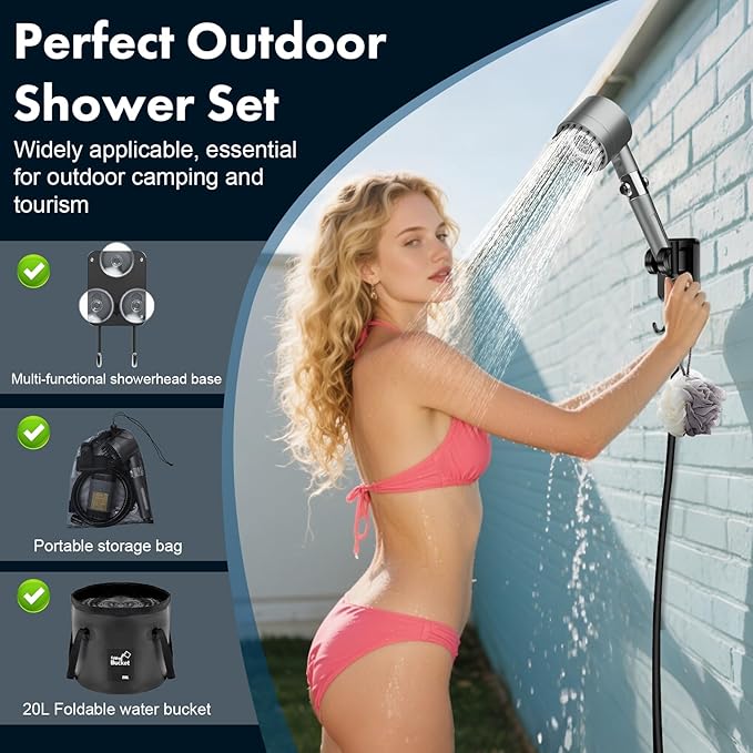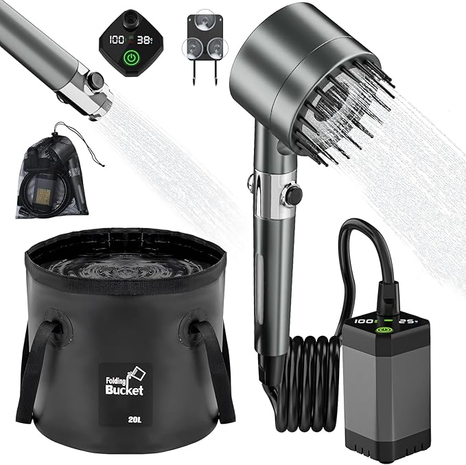 - [The Best Choice for a Camping Essentials]: The portable outdoor shower set includes 1 shower pump, 1 output hose, 1 shower head, 1 storage bag, 1 20L folding bucket, 3 suction cups, and 1 charging cable. This battery operated shower is suitable for indoor/outdoor showers, camping, barbecues, hiking, beaches, travel, bathing, pet baths, car washing, plant watering and more indoor and outdoor uses. It offers convenience for all outdoor needs and is an excellent gift for outdoor enthusiasts.