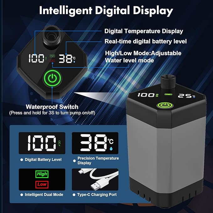 - [Real-time Intelligent LED Display]: This portable shower pump can monitor the battery level and adjust water temperature in real time through the LED display. This camping shower pump has two modes that can be switched: high-power mode and low-power mode. The "high" mode is bright green and the "low" mode is bright red. The water temperature range is 32-140°F (0-60°C). Note: The portable outdoor shower has no heating function. Do not use water above 60°C to avoid scalding.