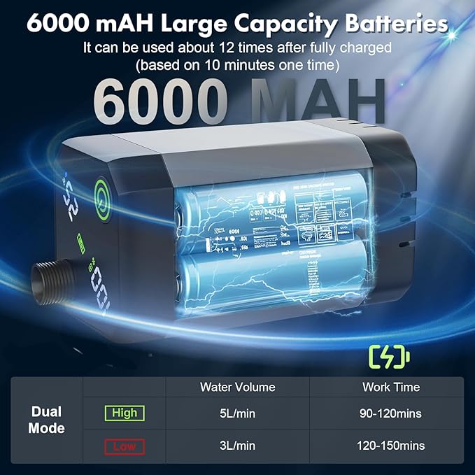 - [Portable Shower Camping Set]: Our usb portable shower has a long-lasting 6000 mah battery capacity and can work for 4 to 6 hours. The maximum water flow rate is 2 gallons (8 liters) per minute. This camp shower can be charged via a power bank, a computer or a car. This portable shower head is perfect for outdoor adventures.