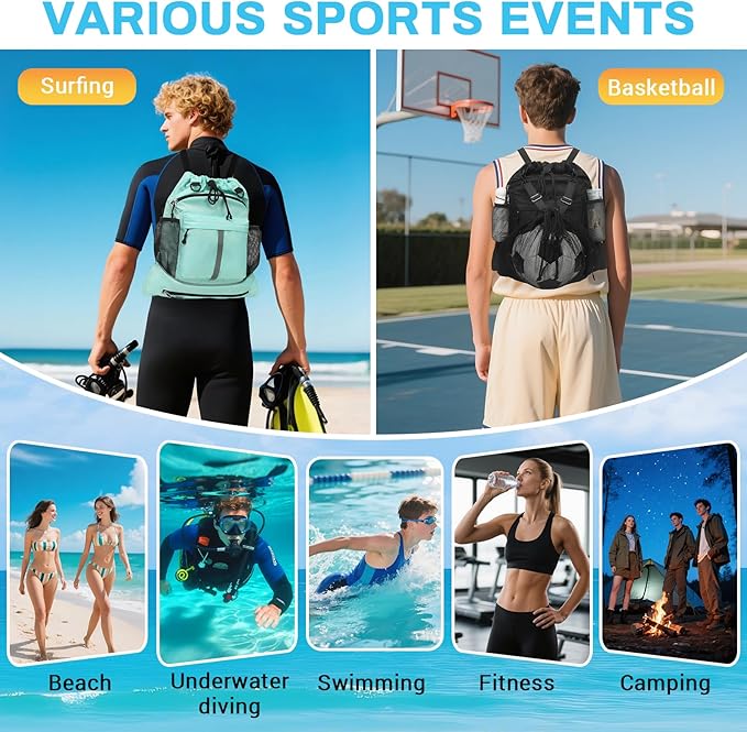 - Hidden Expandable Mesh Pocket: the sport bag backpack's tear-resistant mesh bag allow you to carry beach supplies, surfing equipment and all kinds of ball securely. Quickly empty sand/dirt through the breathable mesh. Easy to clean and dries quickly