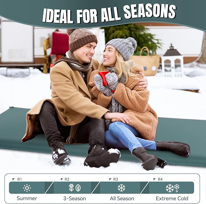 - Four-Season Versatility: With an impressive R-value of up to 9.5, our camping mattress pad is engineered for year-round use. Delivering unmatched thermal regulation in scorching summers and freezing winters for a comfortable night’s sleep. Embrace outdoor adventures in any season with confidence, knowing you have the perfect sleeping solution at your side. Besides, this camping mattress pad is easy to clean, just wipe it clean with a damp cloth.Simplifies post-trip maintenance.