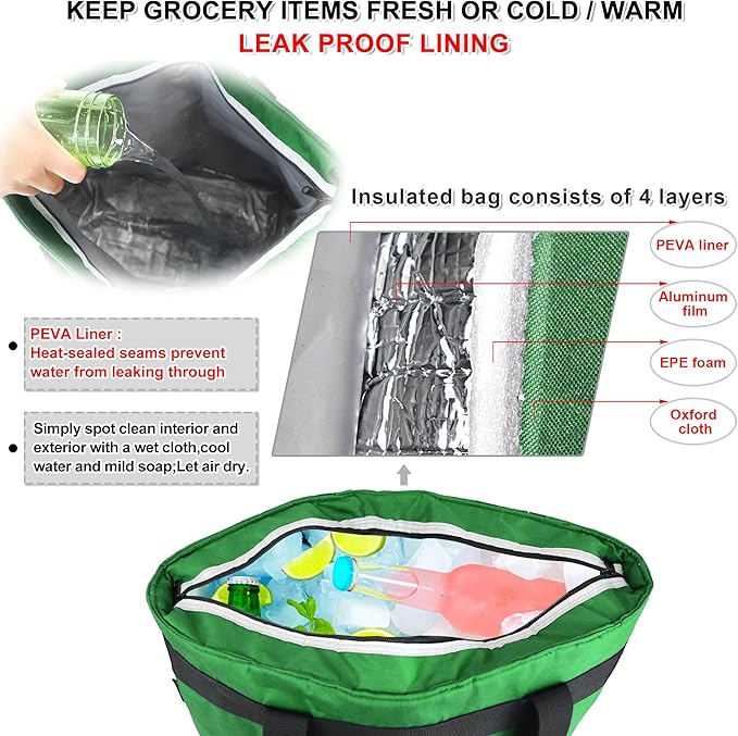 - Inside Easily Wipes Clean & Machine Washable:Our insulated thermal bag with zippered top and handles. our freezer cooler for food transport can keep your items inside even and safe, and the special lining makes water or soup inside won’t leak out and also easy to clean. this grocery cooler bag is 100% safe for machine washing on gentle cold cycle or simply wash by hand as needed.