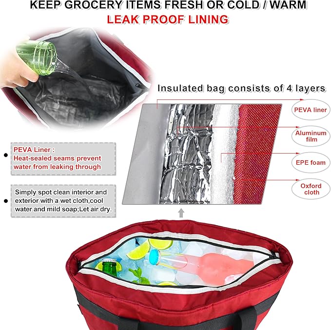 - Inside Easily Wipes Clean & Machine Washable:Our insulated thermal bag with zippered top and handles. our freezer cooler for food transport can keep your items inside even and safe, and the special lining makes water or soup inside won’t leak out and also easy to clean. this grocery cooler bag is 100% safe for machine washing on gentle cold cycle or simply wash by hand as needed.