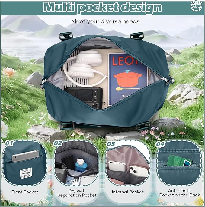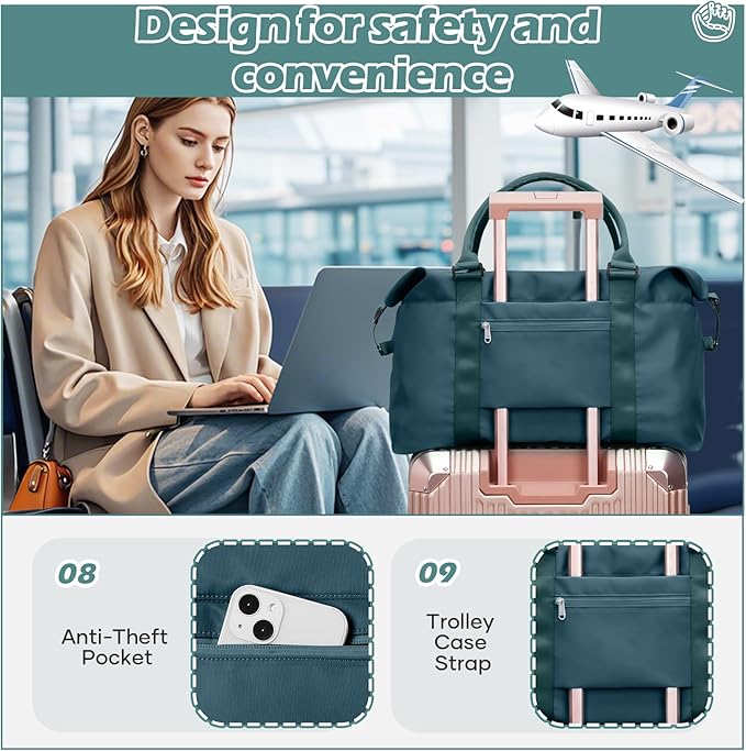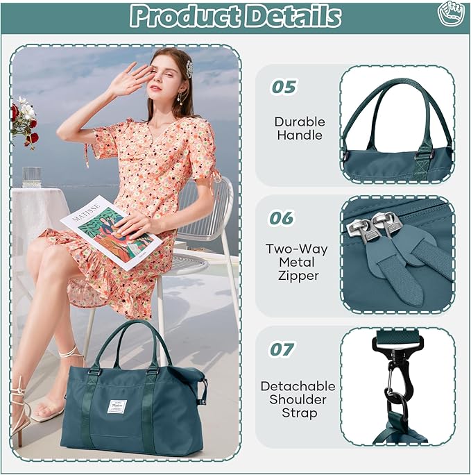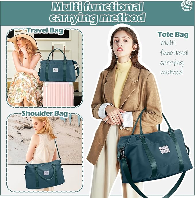 - 【Large and Multiple pockets Overnight bag】This overnight bag has six multiple internal and two external organizational pockets,which ensure you have a place for everything.The dimensions of the overnight bag for women are 10.63"*21.65"*7.09".You can carry it onto an airplane. Large storage space for a clothes for short trip. It has a capacity of 30L and can hold 6 to 8 pieces of summer clothes,Cosmetics, toiletries, wallets, keys, earphones, mobile power, mobile phones, files.