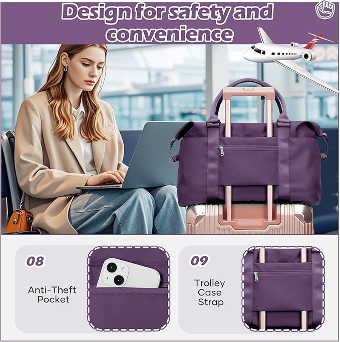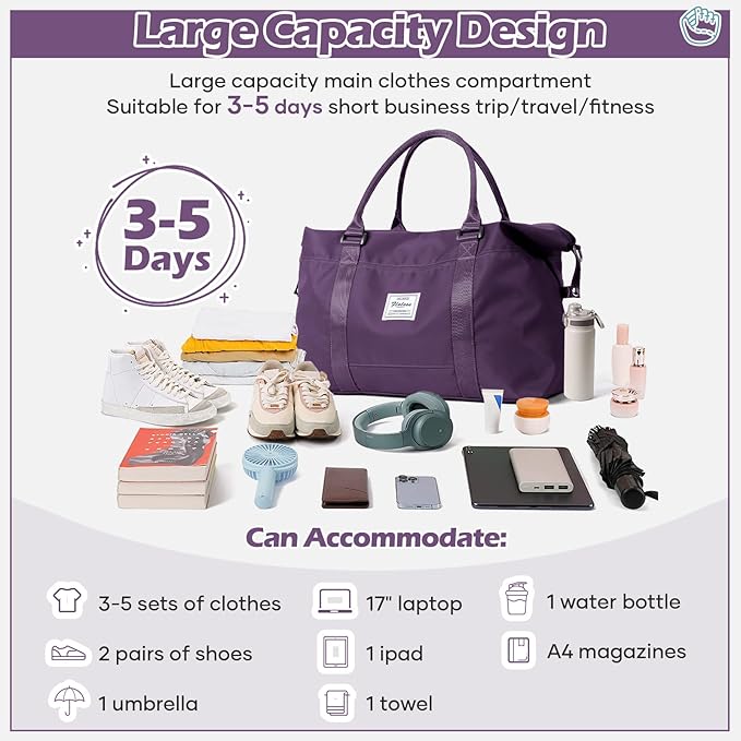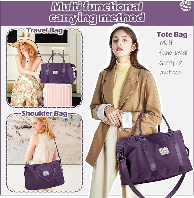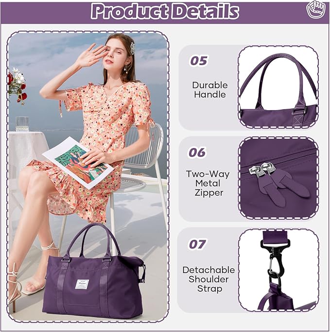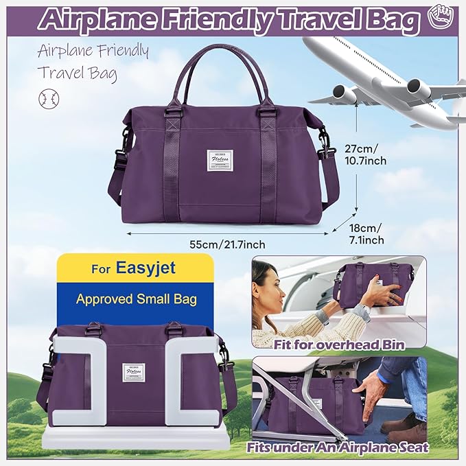 - 【Large and Multiple pockets Overnight bag】This overnight bag has six multiple internal and two external organizational pockets,which ensure you have a place for everything.The dimensions of the overnight bag for women are 10.63"*21.65"*7.09".You can carry it onto an airplane. Large storage space for a clothes for short trip. It has a capacity of 30L and can hold 6 to 8 pieces of summer clothes,Cosmetics, toiletries, wallets, keys, earphones, mobile power, mobile phones, files.
