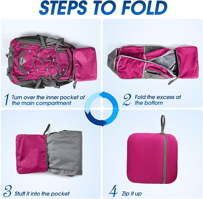 • 【Foldable & Comfortable】This lightweight trekking backpack only 1 pound, it can fold easily into its own pocket for storage and unfold when needed. Breathable mesh shoulder straps with plenty of foam padding help relieve pressure on the shoulders. The chest buckle is designed as a survival whistle for quick and easy access in an emergency. The chest strap buckle perfectly distributes the weight of the packable hiking backpack and keeps it stable and centered.
