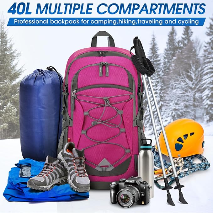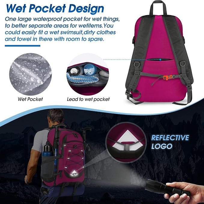 • 【Large Capacity&Multi Compartment】This portable hiking backpack has 40 liters of storage space with a multi-compartment design that includes 1 main zipper compartment, 2 zipper front pockets, 2 side pockets, and a waterproof wet pocket. The pen pocket and slip pockets in the front can help you organize your items more easily. The large capacity backpack helps you to easily storage all your essentials for your outing.